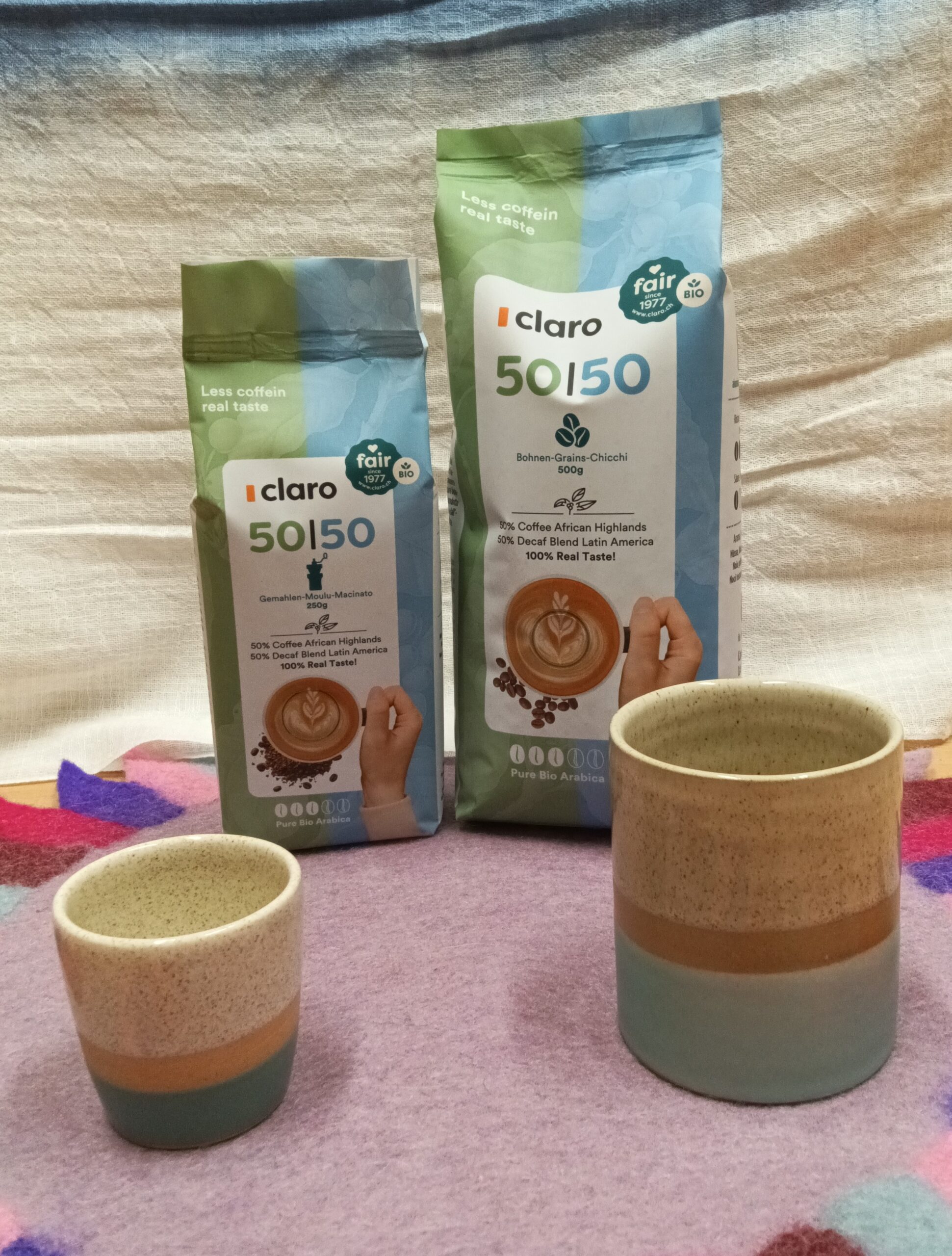 Diese einmalige Kaffeemischung besteht aus 50% Bohnen mit Koffein und 50% entkoffeinierten Bohnen und bietet so eine ideale Mischung aus einem kräftig mundenden Kaffee mit weniger Koffeingehalt. Die koffeinhaltigen Bohnen stammen von Kleinbauern aus dem afrikanischen Hochland, wohingegen die entkoffeinierten Bohnen von unseren langjährigen Partnern aus Peru und Mexiko stammen. Beides sind reine Arabica Bohnen.